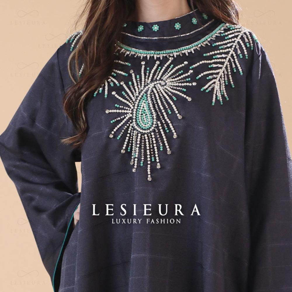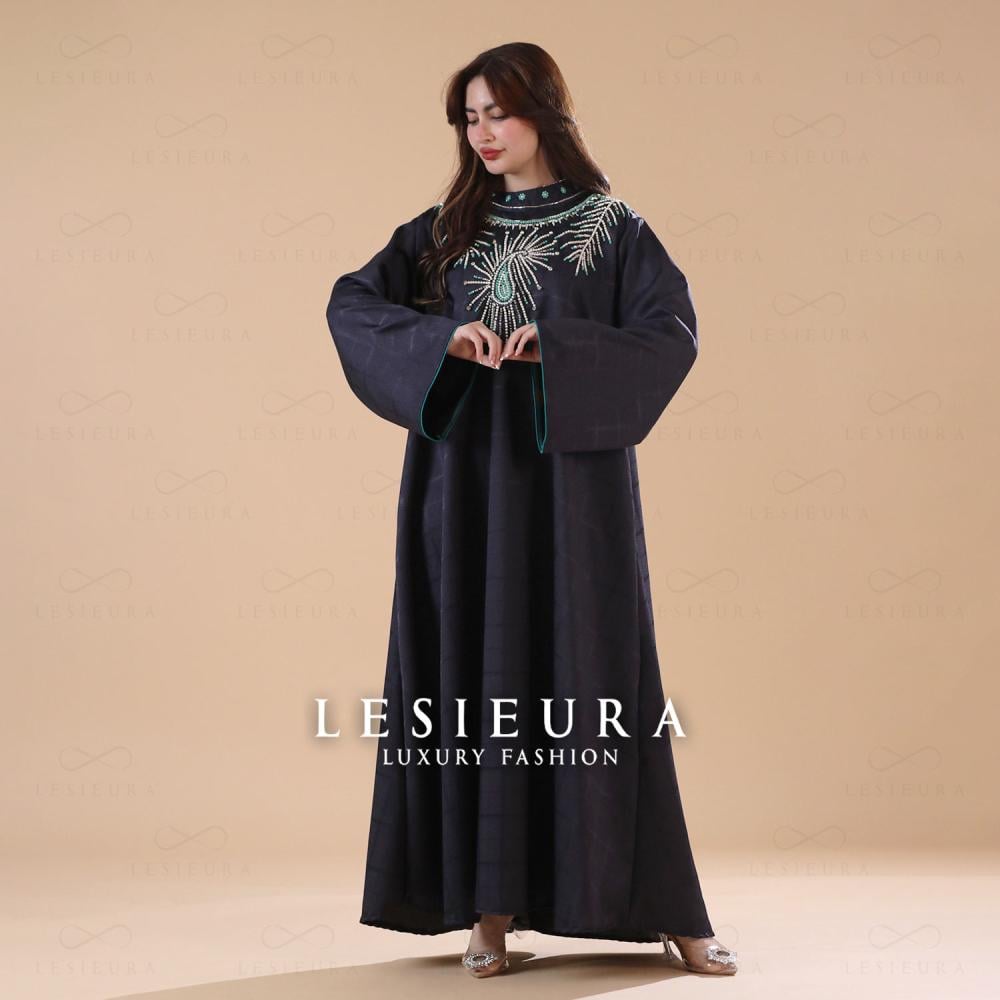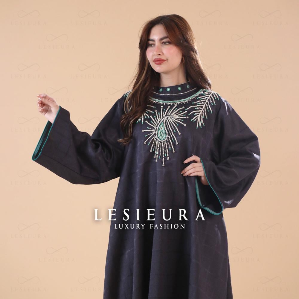 يأتي التصميم باللون الكحلي الغني الذي يضفي لمسة من الرقي، مزين بتفاصيل تطريز أنيقة بلون التيفاني الفاتح لتضيف إشراقة فريدة تبرز جمال الإطلالة. الأكمام الواسعة تضفي انسيابية وأناقة، بينما يمنح القماش الناعم راحة فائقة تناسب مختلف المناسبات.