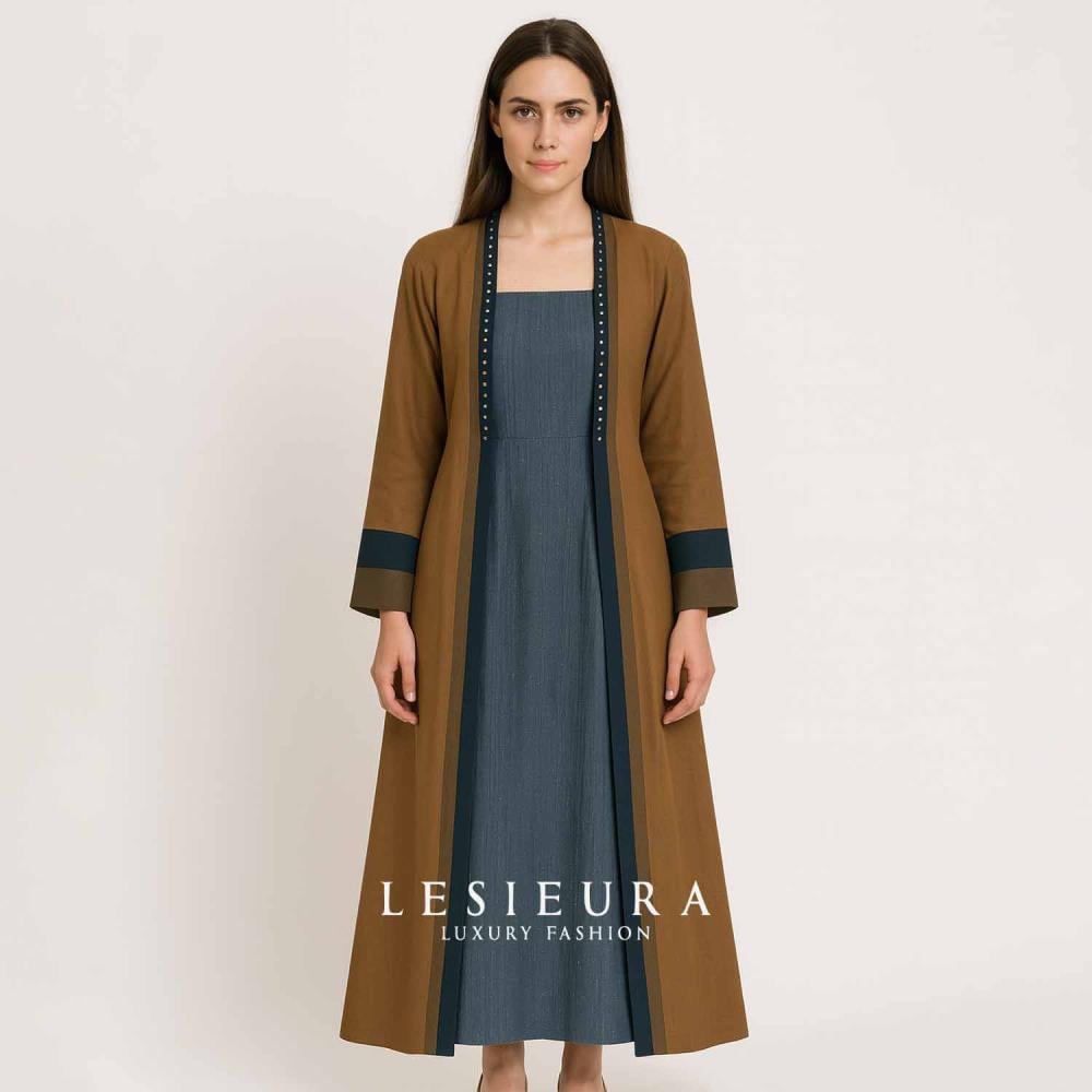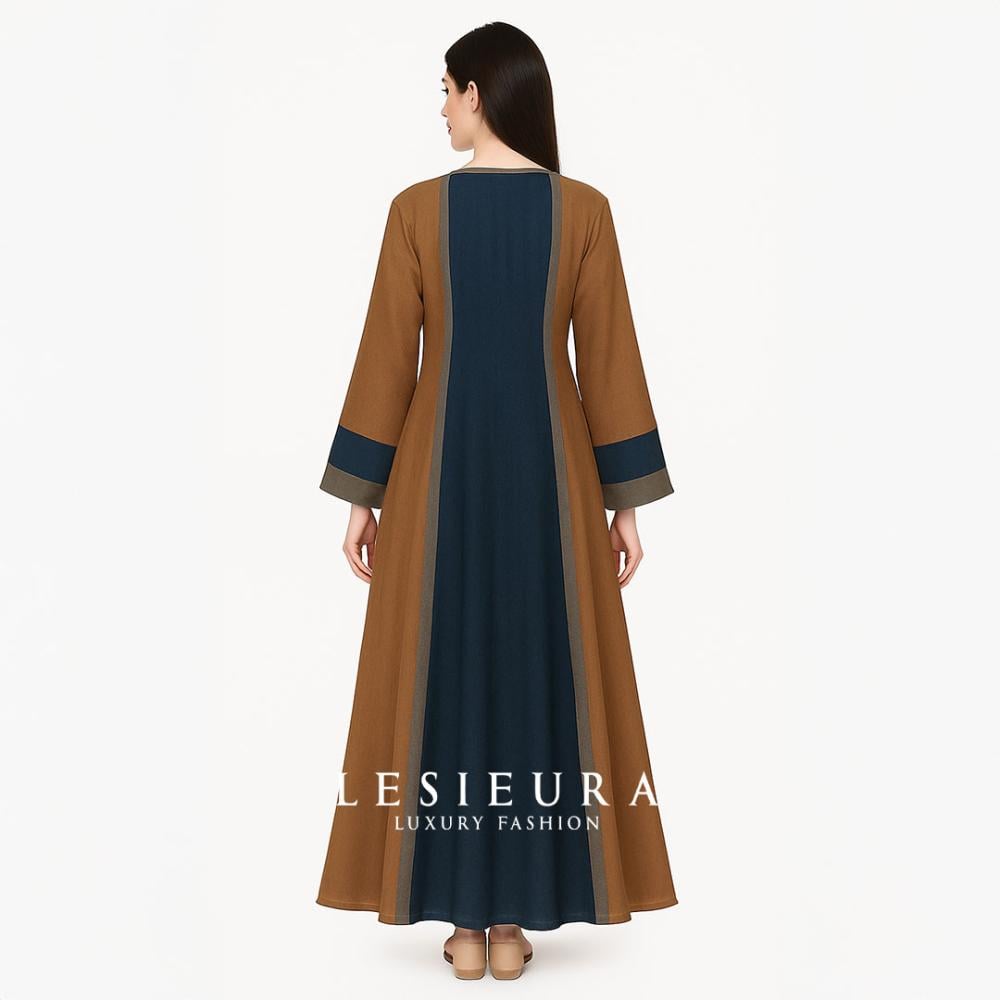 بتصميم انسيابي يعكس أناقتكِ الطبيعية، تأتي هذه الجلابية بلونين متناغمين من البني الدافئ والأزرق الليلي، مزدانة بكريستالات لامعة تضفي بريقًا ناعمًا وراقياً على منطقة الصدر.