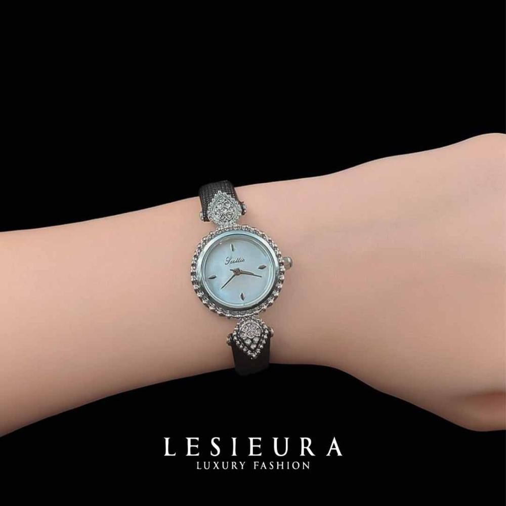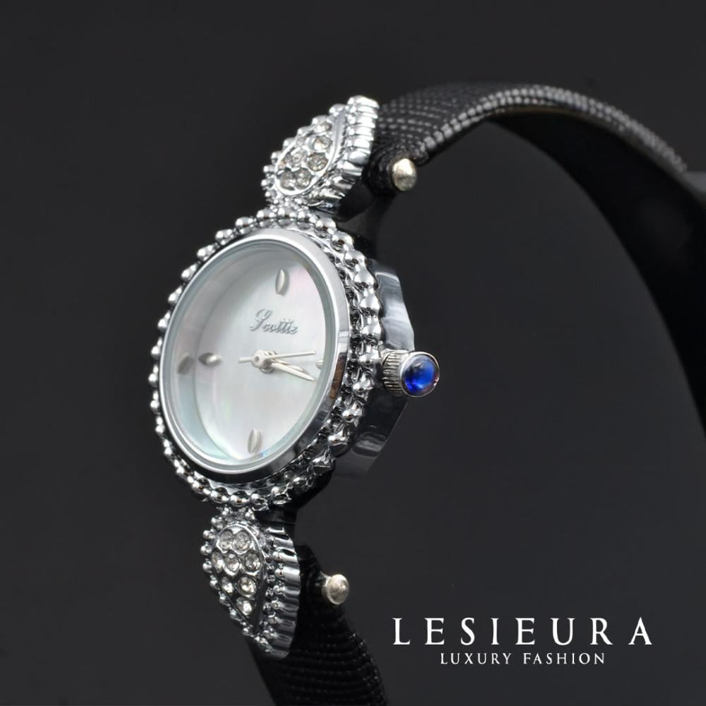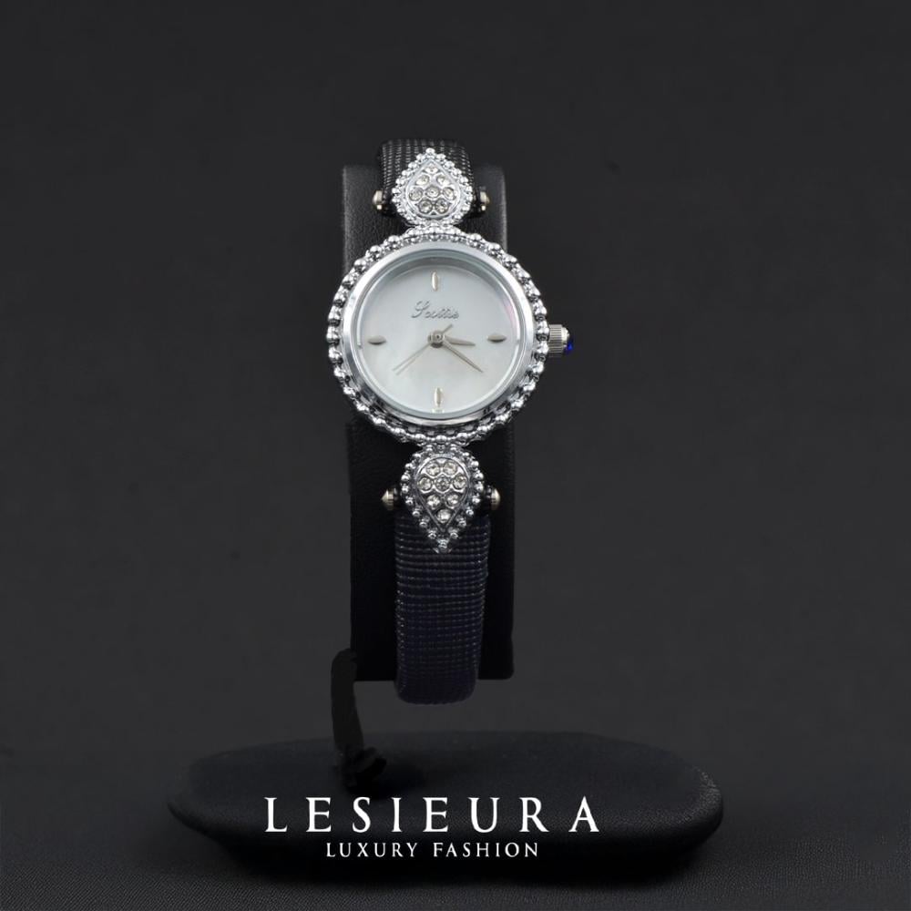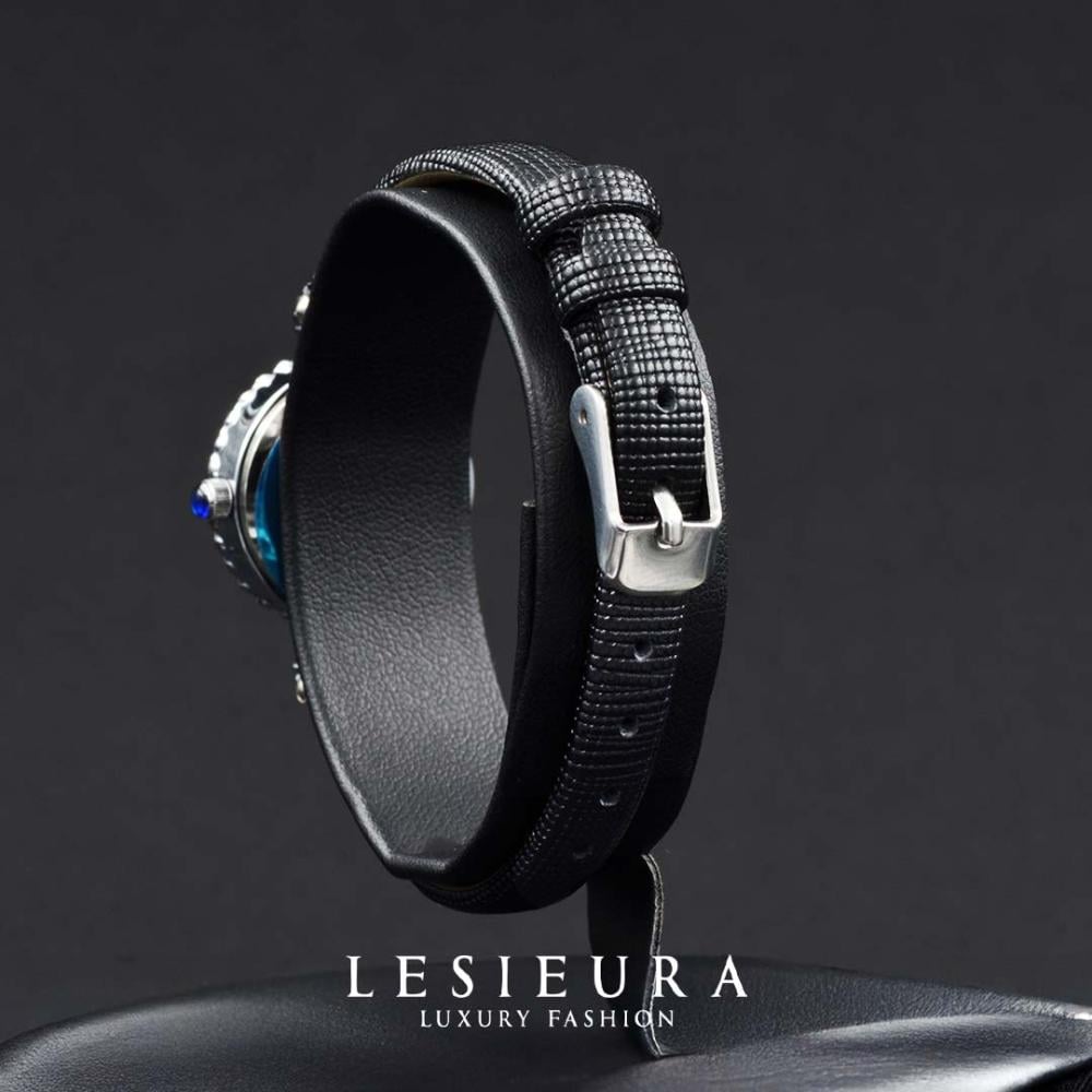 تصميم أنيق يجمع بين هدوء الأسود وبريق الفضة، حيث تتناثر اللمعة حول المينا كنجوم من نور، وتلتف حول المعصم بحنان لا يُرى إلا في أدق تفاصيل الحضور.