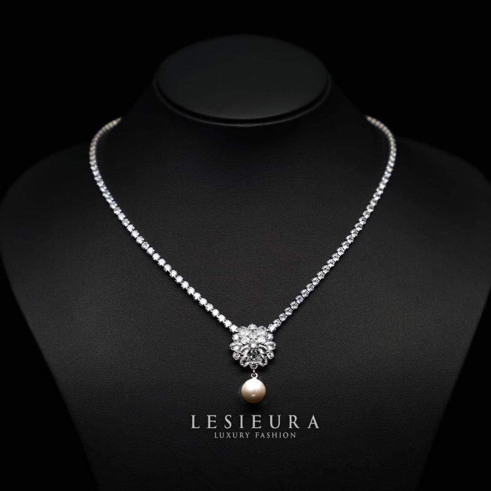 - عقد أنيق: يتميز بتصميم كلاسيكي مزين بحبات شبيهه بالالماس متألقة وزهرة مركزية تضيف لمسة ملكية فاخرة .