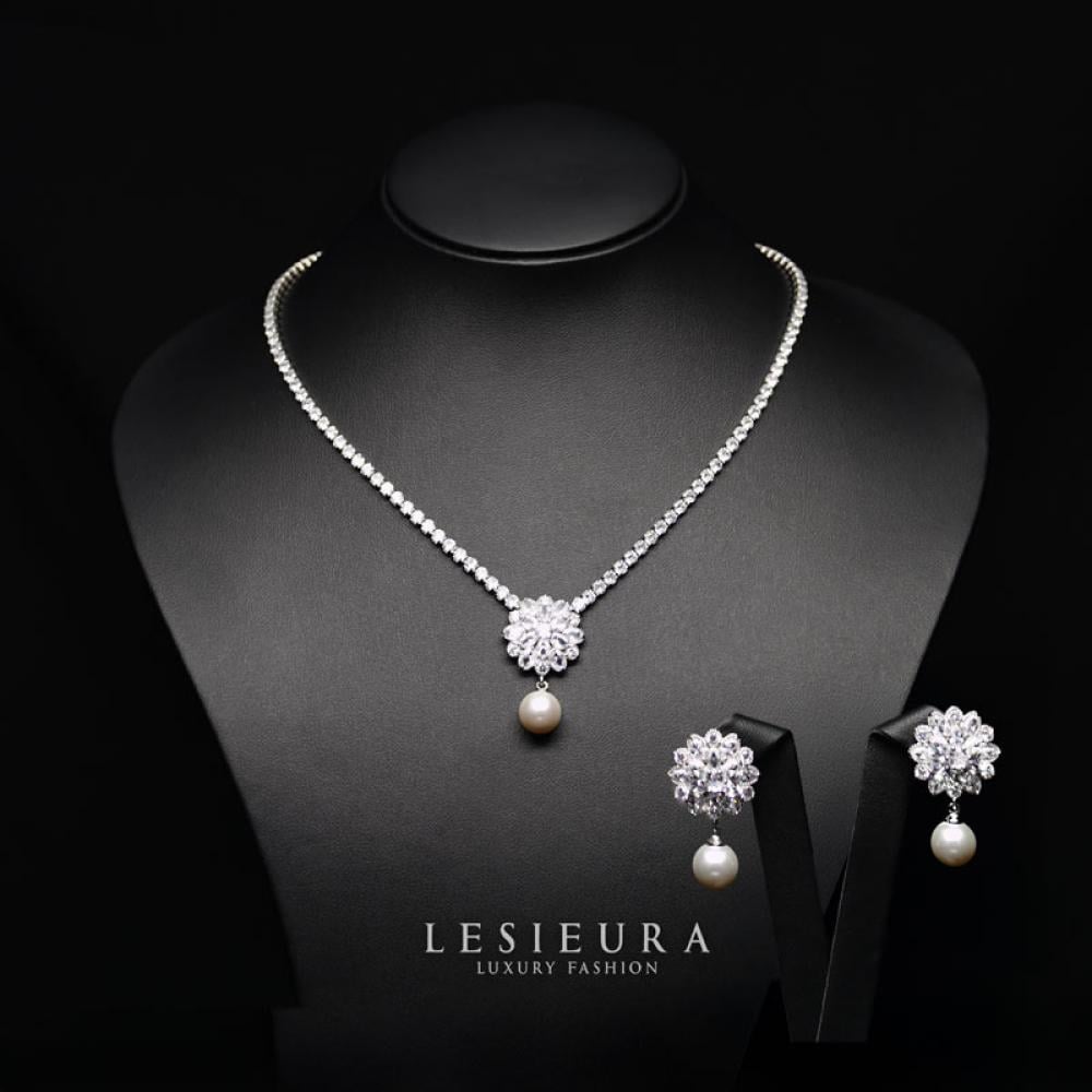 يمثل هذا الطقم انعكاسًا للأناقة والفخامة العصرية. يتكون من عقد وأقراط مصممة بدقة باستخدام حبات شبيهه بالألماس براقة تضفي لمسة ساحرة ومتألقة. التصميم يتميز بزخارف زهرية أنيقة، مما يجعله مثاليًا لإطلالات السهرات والمناسبات الخاصة.