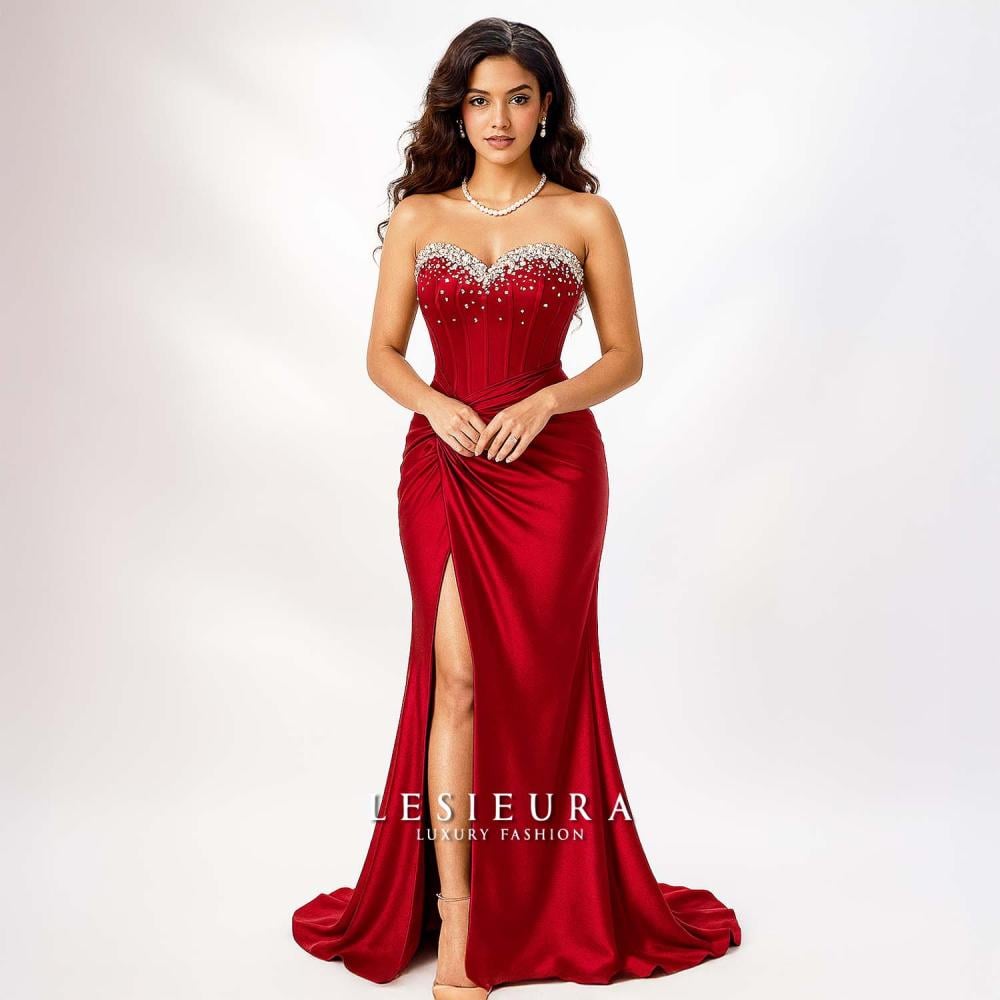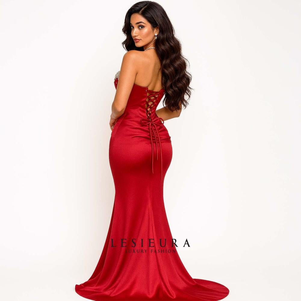 يتميز الفستان بكورسيه مصمم بدقة عالية، بدون أكمام، بقصة صدر على شكل قلب، مرصع بالكامل بكريستالات لامعة تمنح الإطلالة لمعة مترفة تظهر مع كل حركة. أما القصة السفلية، فتنسدل بتنورة ضيقة تنفتح بشق جانبي أنيق يعزز الطابع الجريء للفستان ويمنح حرية وانسيابية مثالية.