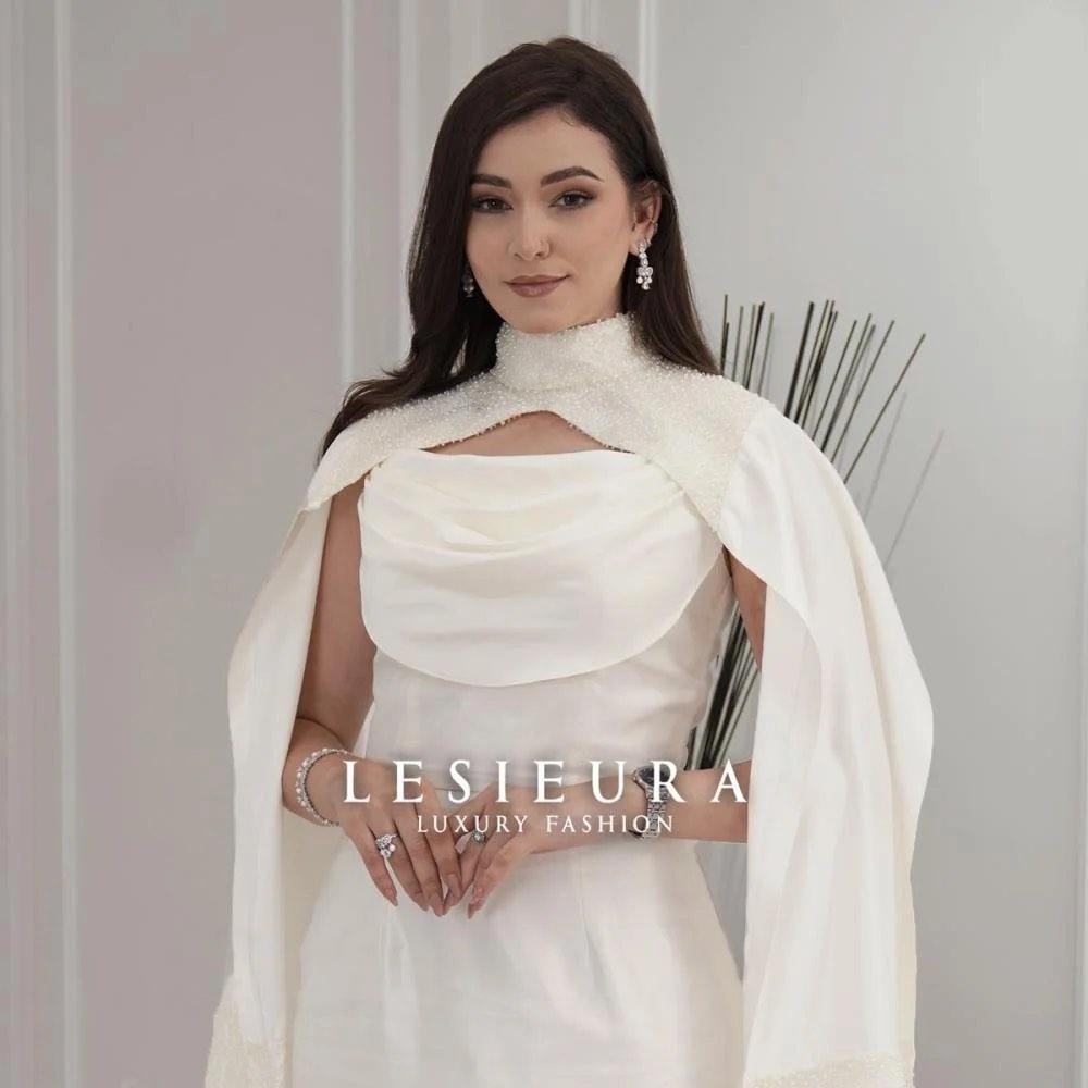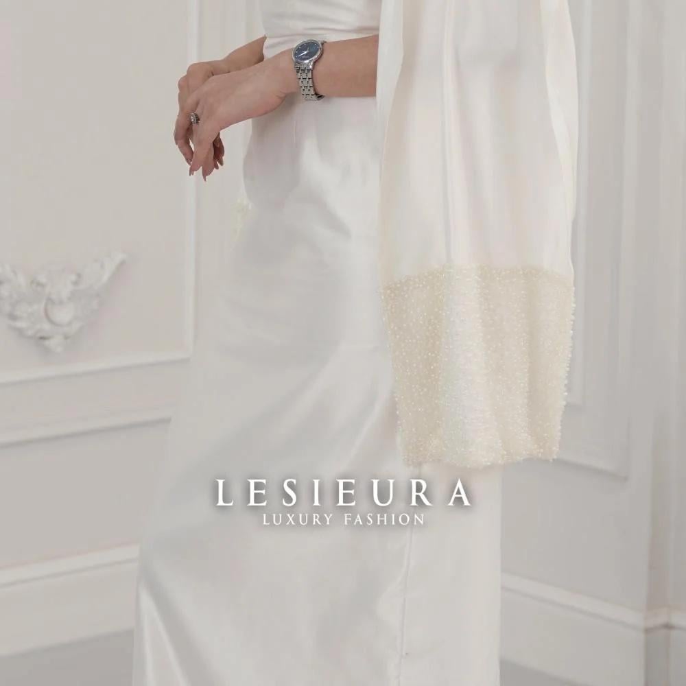 فستان سهرة أبيض طويل مع شال لؤلؤ فاخر – تألقي بإطلالة راقية وأنيقة