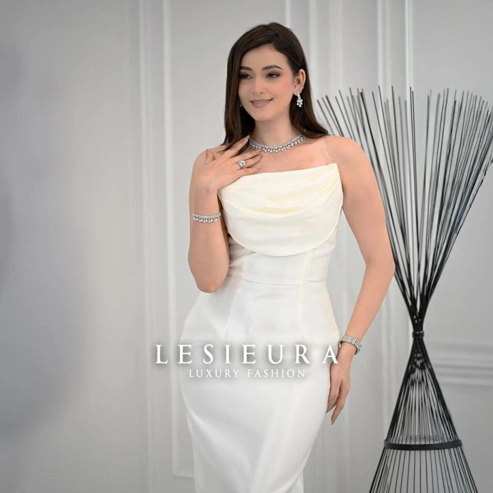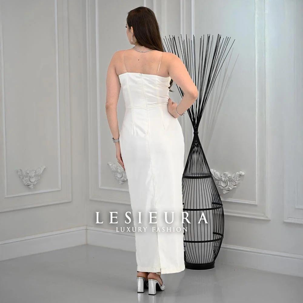 القماش الأبيض الفاخر يعكس الإشراقة والنقاء، مما يجعل هذا الفستان خيارًا مثاليًا للمناسبات الخاصة، السهرات الراقية، وحفلات الزفاف، حيث يجمع بين البساطة والفخامة بأسلوب عصري ساحر.