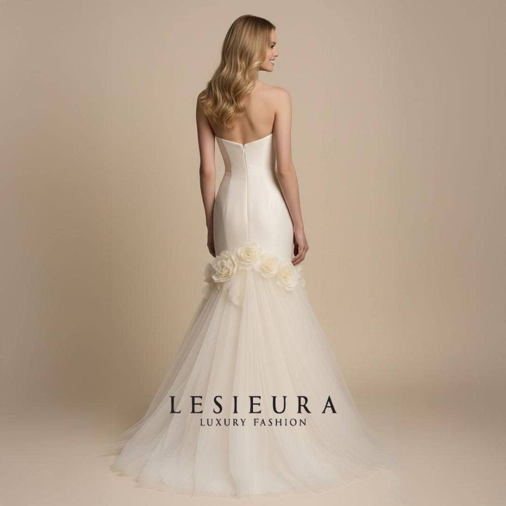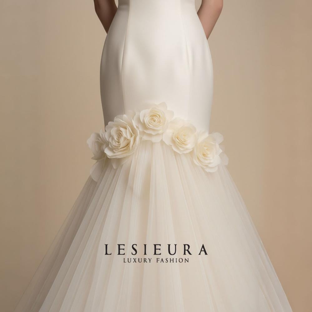ثم ينسدل بسلاسة إلى الأسفل حيث تتفتح ثلاث ورود كبيرة مصنوعة يدويًا تثبت اسفل الورك كلمسة شاعرية تُحول التصميم من عادي إلى استثنائي.