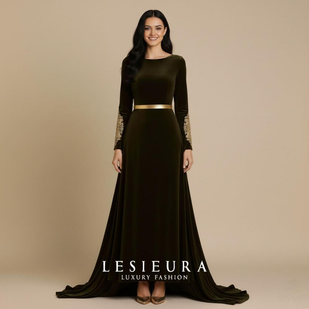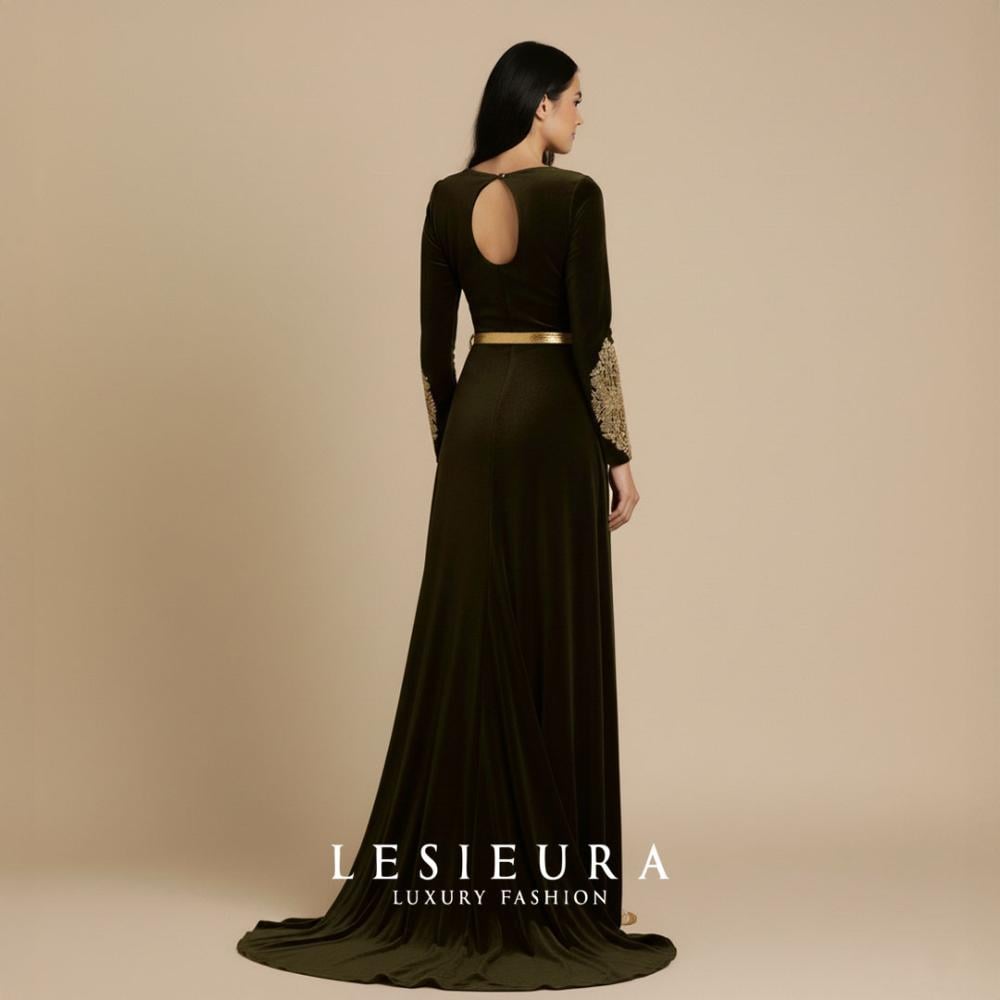 فستان إميرالد تحفة من المخمل الفاخر بلونه الزيتوني العميق، ينساب بانسيابية راقية ليعكس هدوء القوة وجمال التفاصيل المتقنة.