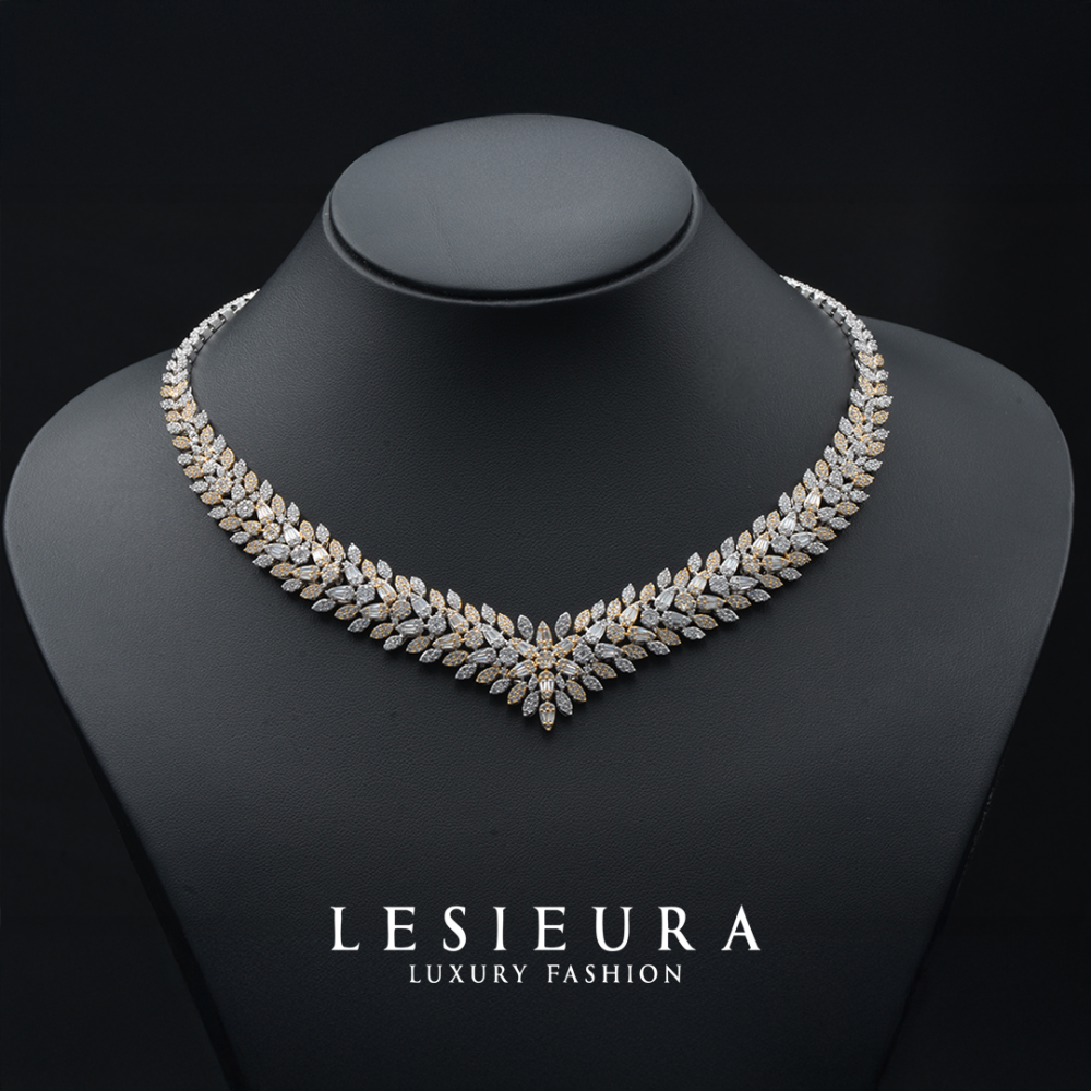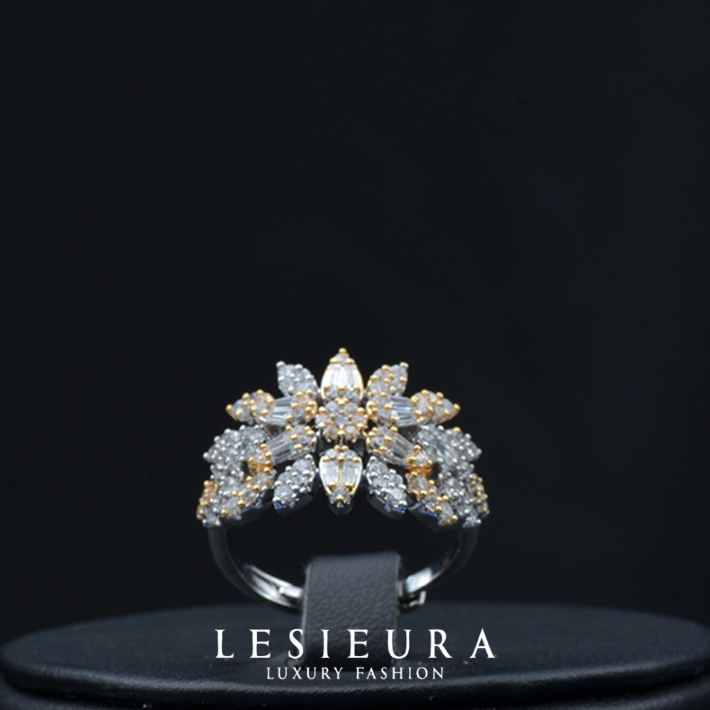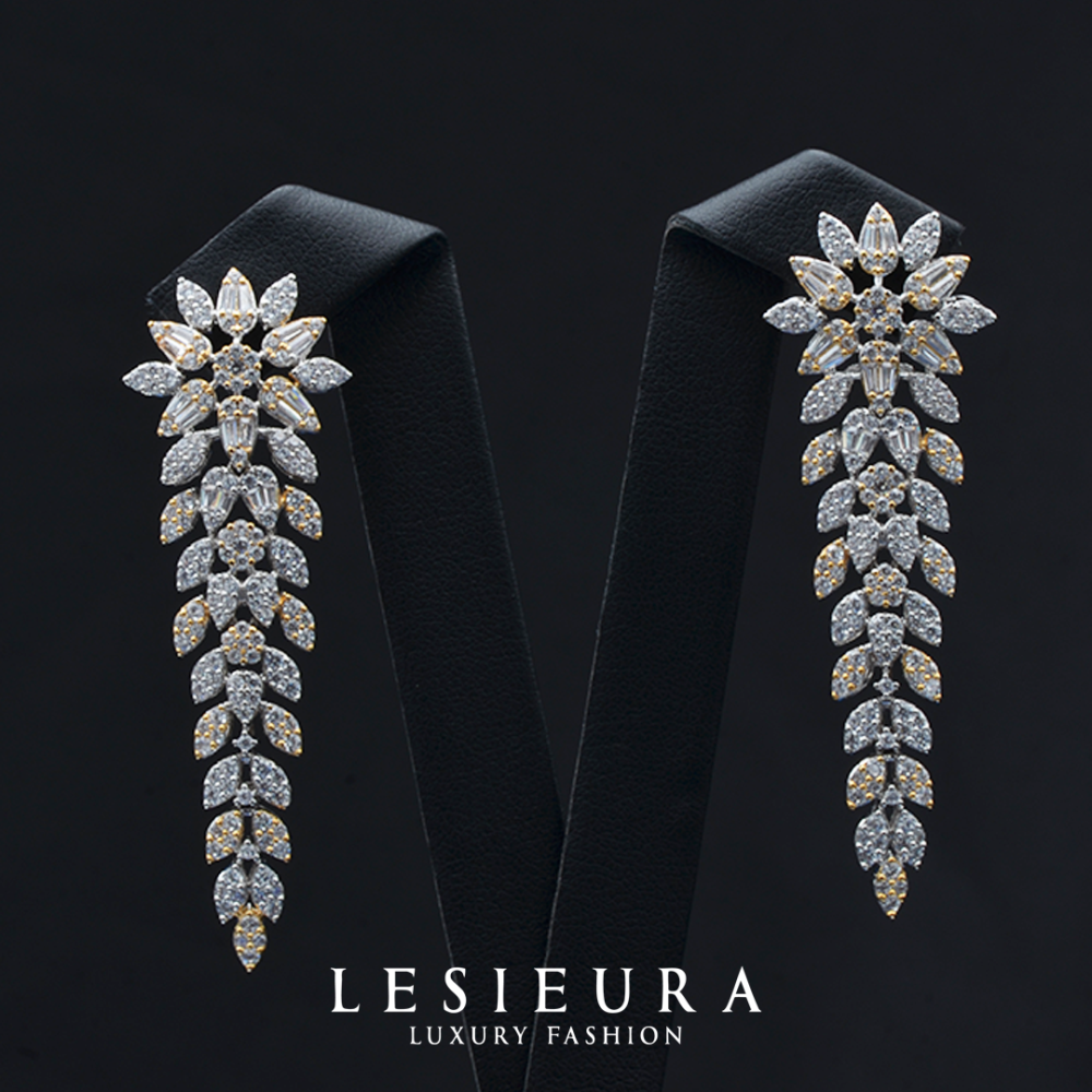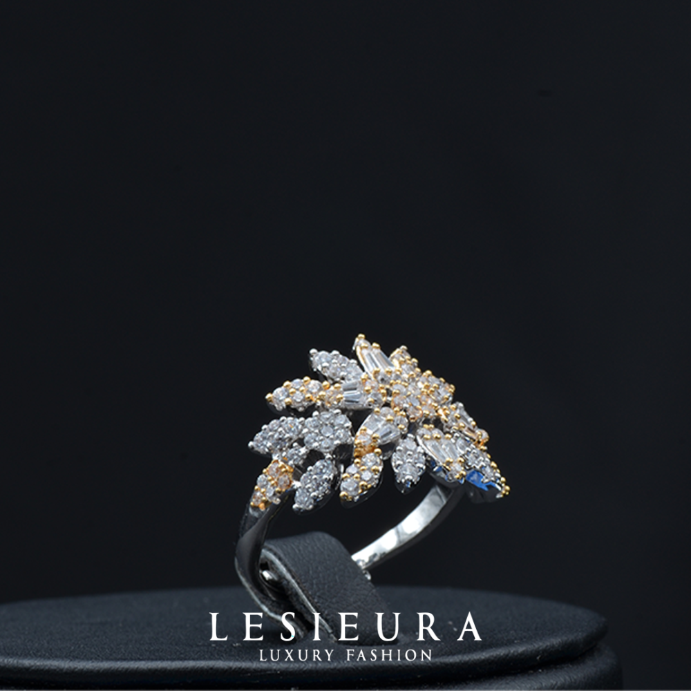 يتألق التصميم بتشابك فروعٍ أنيقة بلونين ذهبي وفضي متناغمين، مرصّعة بفصوص زركون لامعة تلتقط الضوء بخفةٍ راقية.
