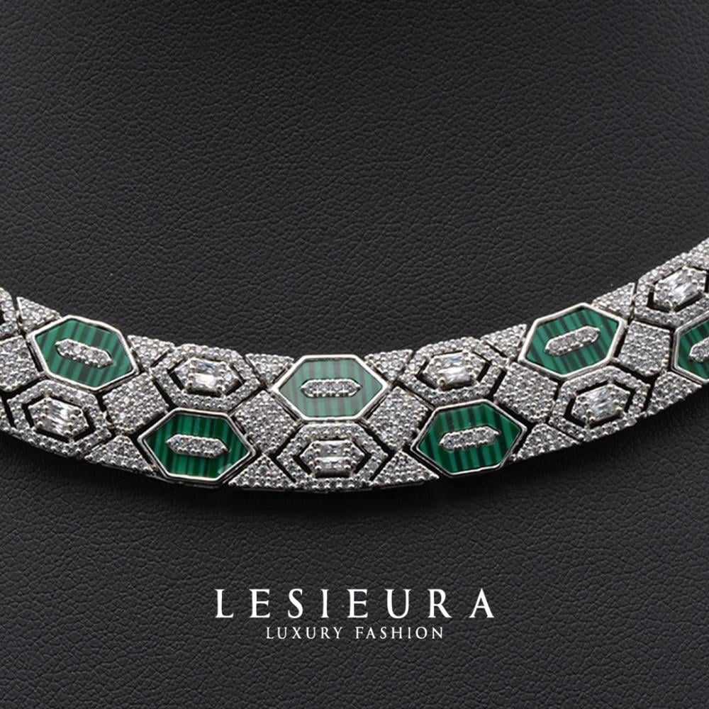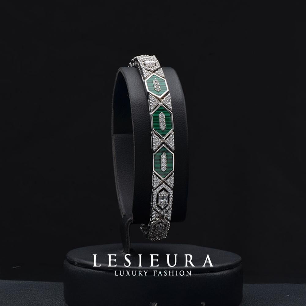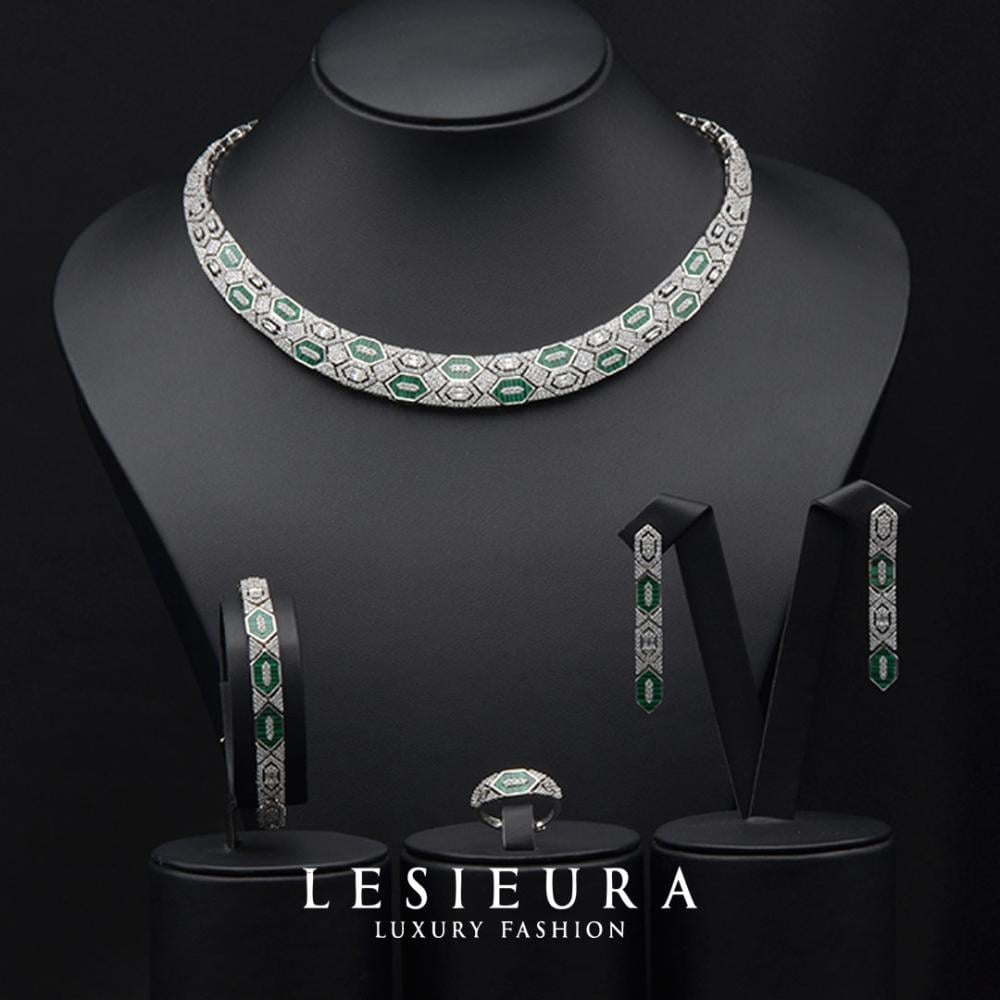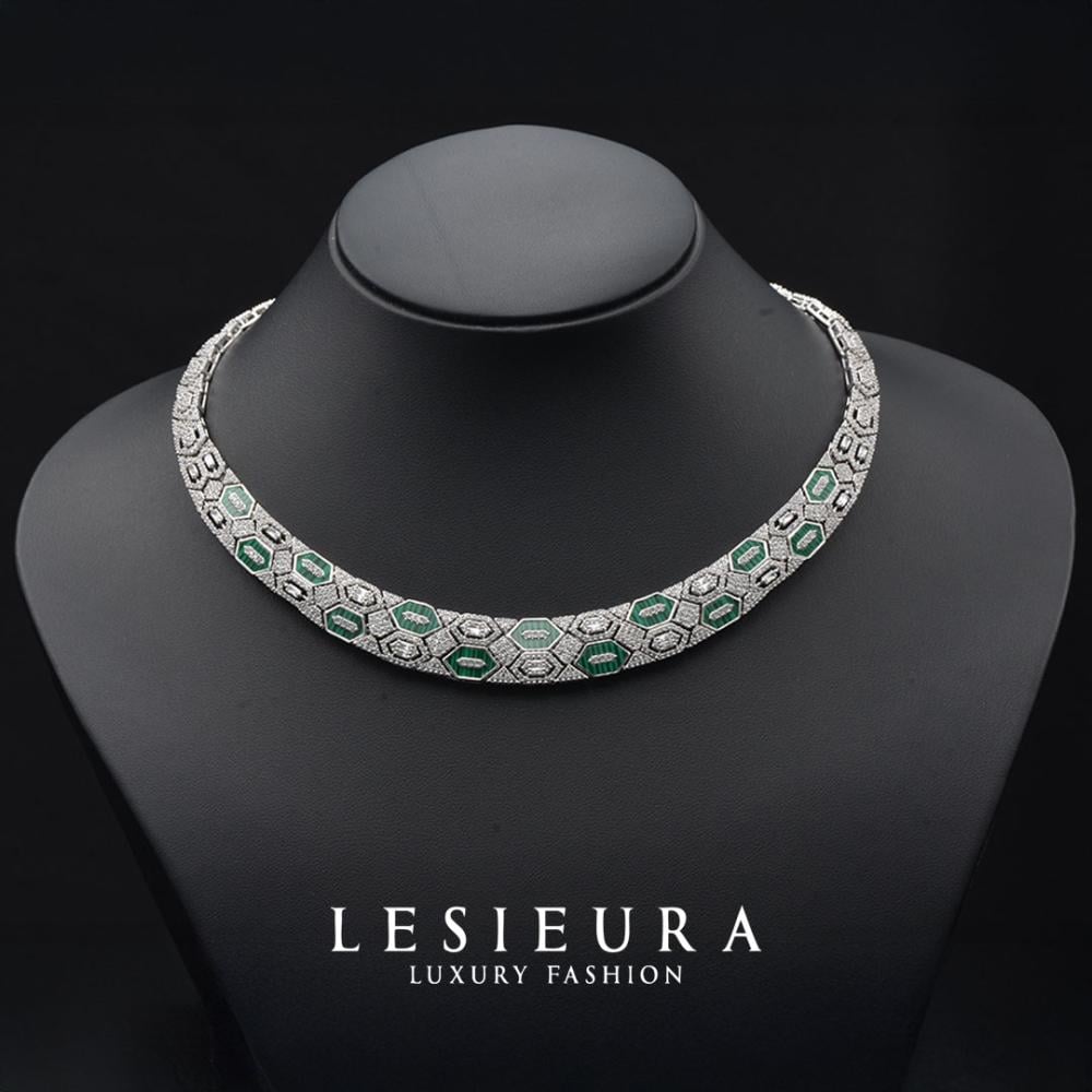 تتناثر الفصوص الخضراء الفاخرة وسط زخارف من الزركون الأبيض المتلألئ، في تنسيق يشبه قطع الفسيفساء الملكية، لتقدم لكِ طقمًا يليق بمناسبات لا تتكرر.